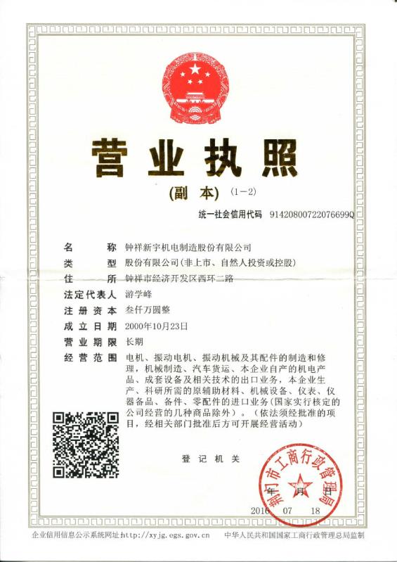 ? ? ? ?鐘祥新宇機電制造股份有限公司前身是鐘祥電機廠,1968年 籌建工廠,原機電部確認(rèn)為定點生產(chǎn)中小型電機的專業(yè)廠家。于2014年09月24日由“鐘祥新宇機電制造有限公司”變更名為“鐘祥新宇機電制造股份有限公司”。主要生產(chǎn)各類振動電機、振動機械、輸送機械。是中國電器工業(yè)協(xié)會中小型電機分會理事單位、中國重型機械工業(yè)協(xié)會洗選設(shè)備專業(yè)委員會理事單位,是中國大型的振動電機生產(chǎn)廠家。